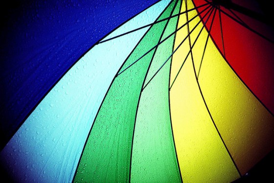 Diante do guarda-chuva colorido.
